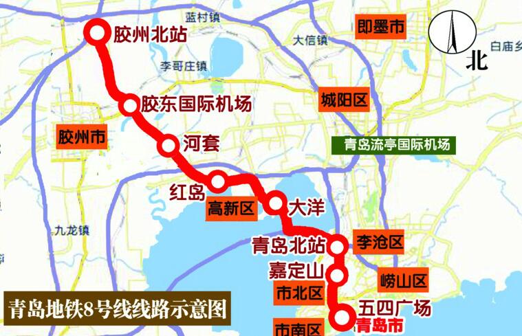 青島地鐵8號線工程起點自膠州北站,終點至五四廣場,全長61.4公里,設車站18座,其中高架站1座,地下站17座,連接了膠州北站、膠東國際機場、紅島火車站、青島北站、五四廣場站等五大交通樞紐,是連接青島新機場、北岸城區、東岸城區的快速骨干線路。